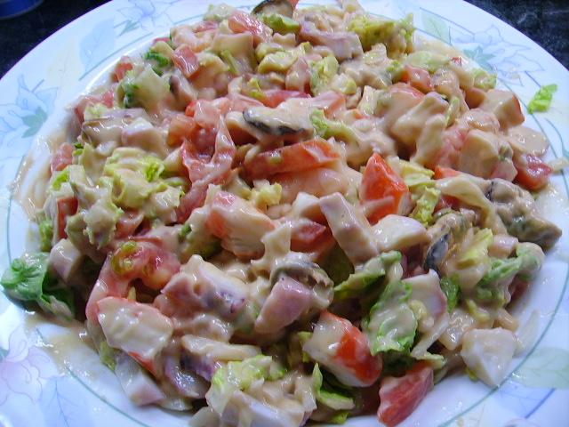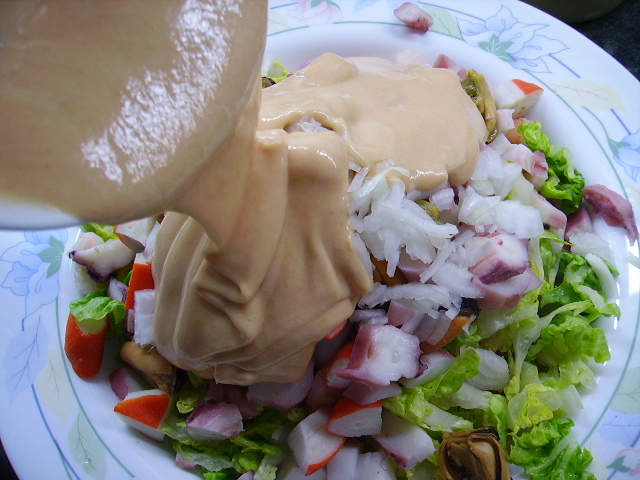 5.- Salamos la ensalada y ponemos la salsa, removiendo todo para que tome el sabor.