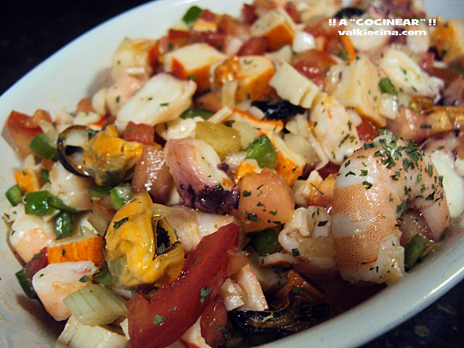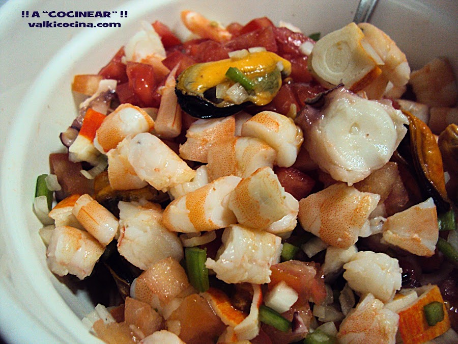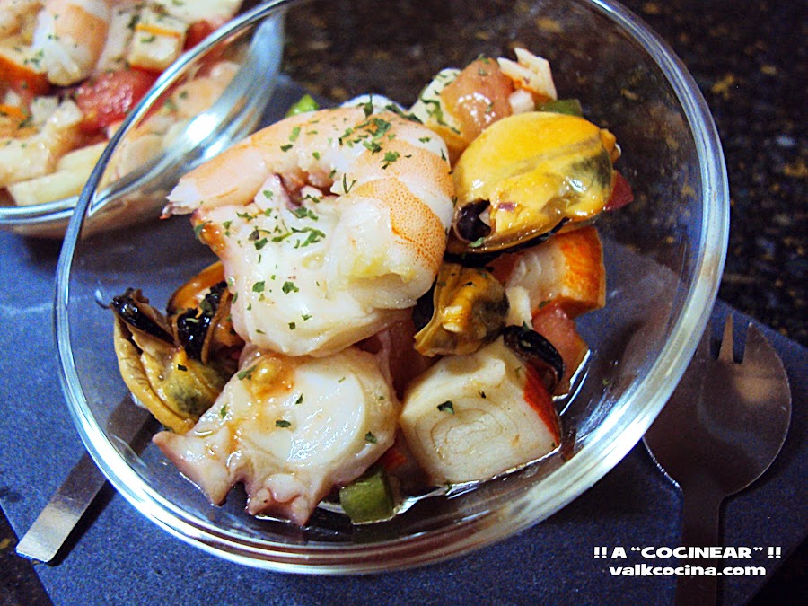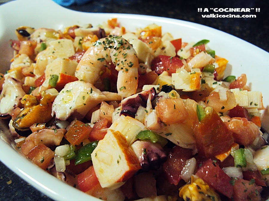 El salpicón de marisco es una combinación deliciosa de diferentes vegetales y mariscos cocidos .., aderezados con una buena vinagreta.
