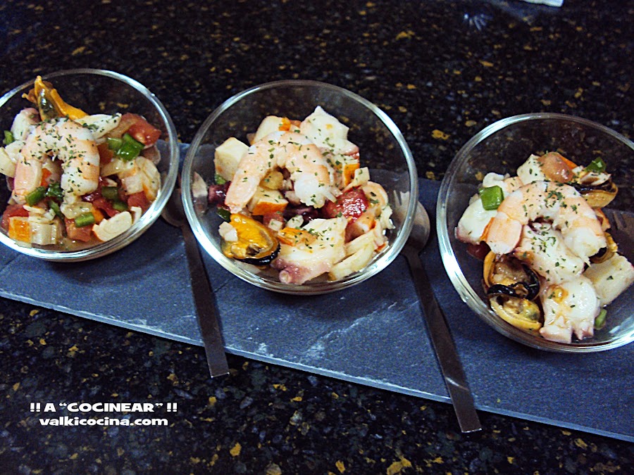 Una vez tengas el marisco cocido, corta en trozos pequeños los vegetales .., en rodajas palitos y pulpo; los langostinos también en trozos y deja alguno para decorar. Los mejillones enteros.