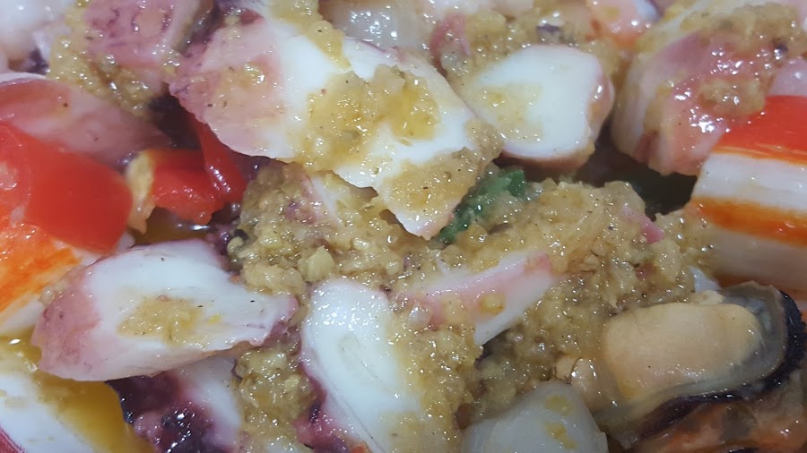 No os pongo cantidades porque según lo que tenga en la nevera, voy poniendo a veces tengo más cantidad de pulpo que de palitos de surimi, o viceversa, o no tengo cebollitas y pongo pepinillos. Ya os digo, lo que hay en mi fondo de despensa.