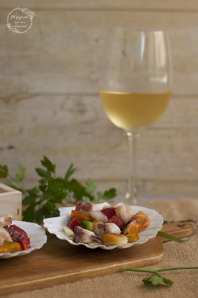 Lo que más va a tardar es el pulpo, por lo que podéis comprarlo ya cocido. Si no, procederemos como normalmente hacemos para cocerlo. Poniendo una olla con agua y cuando llegue a ebullición, cogemos el pulpo por la cabeza e introducimos hasta tres veces, sacando inmediatamente, es una forma de "asustarlo", para que cuando lo dejemos ya en la olla para cocer no se desgarre la piel. Una vez que hayamos procedido al ritual de asustarlo dejamos cocer durante unos 30 minutos, dependiendo del grosor del pulpo. Mientras tanto abrimos al vapor los mejillones, después de haberlos limpiado bien y cocemos las gambas, pelándolas después. Una vez se haya cocido el pulpo lo dejamos enfriar un ratito para poder hacerlo rodajas después.