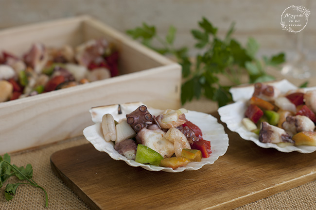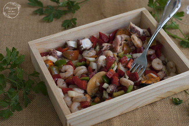 Lavamos y picamos los pimientos, así como la cebolla, disponemos en un bol, añadimos los mejillones, las gambas y el pulpo. Preparamos el aliño mezclando el aceite, el vinagre y un poco de sal. Añadimos y dejamos enfriar un ratito en la nevera. Si lo hacemos de un día para otro estará aún mejor.