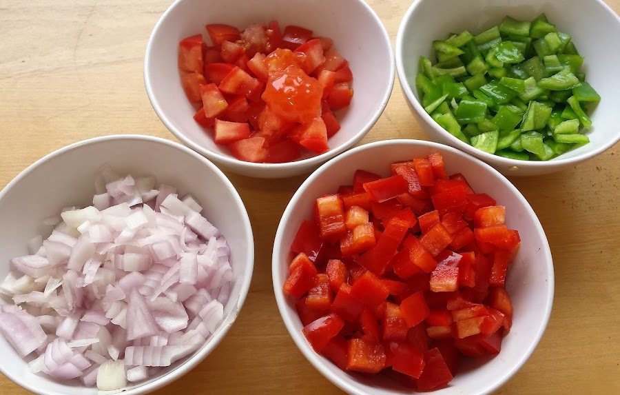 Cortamos la cebolla y los dos tipos de pimiento y la cebolla en daditos pequeños como de 2 cm de lado, este corte se llama mirepoix, reservamos en un bol para que se vayan uniendo los sabores.