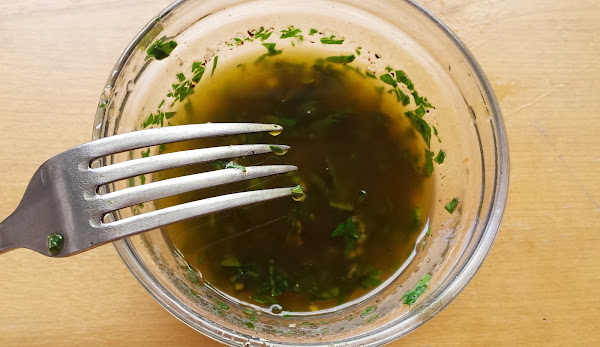 Preparamos una vinagreta con el aceite de oliva virgen extra, el vinagre, el perejil picado, sal y pimienta.