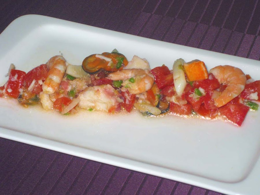 Mientras , en un bol , ponemos el pulpo , los langostinos pelados , los mejillones (yo los he comprado ya cocidos) , las varitas de mar cortadas en rodajas , la cebolla y el pimiento picado muy chiquitito y el tomate cortado en daditos.