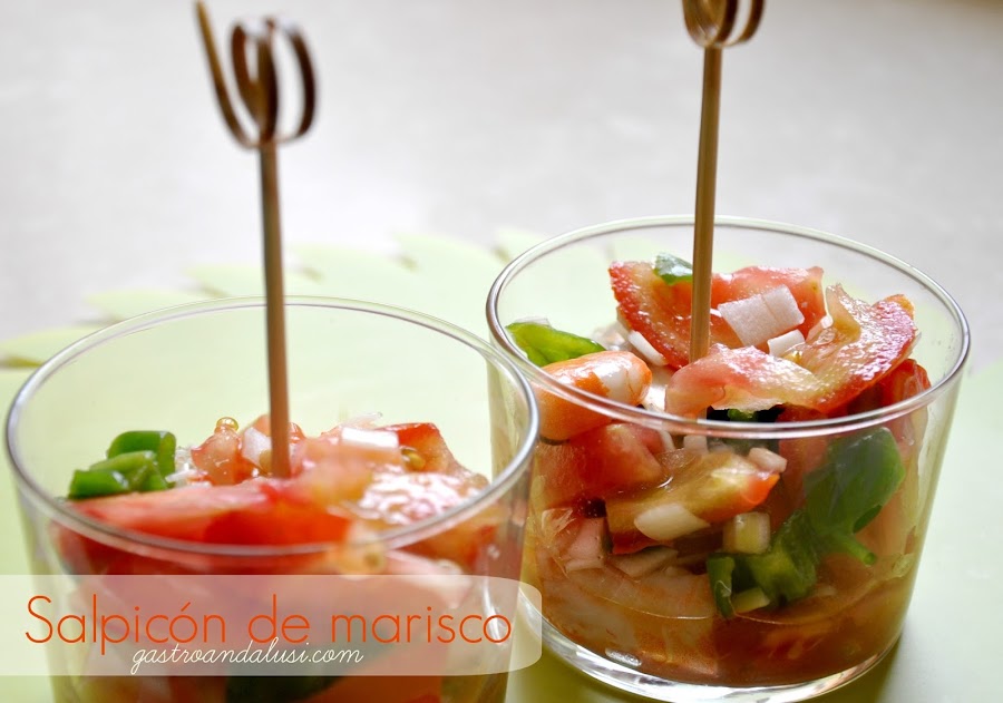 Se cuece el pulpo (nosotros lo hemos cocido tal y como indica la gallega Pilar de "La cocina de lechuza"). Se deja enfriar. Una vez frío, se lamina en trozos de medio centímetro de ancho aprox. y se reserva. Se pelan las gambas previamente cocidas, se abren los mejillones al vapor, se desconchan y se reservan. Ahora picamos la verdura, el tomate y los pepinillos, los palitos de cangrejo en trocitos pequeños. Se reserva. Cuando ya tenemos todos los ingredientes, se vierten en un bol grande y se aliña con aceite de oliva virgen, un poco de sal y vinagre de Jerez generoso.