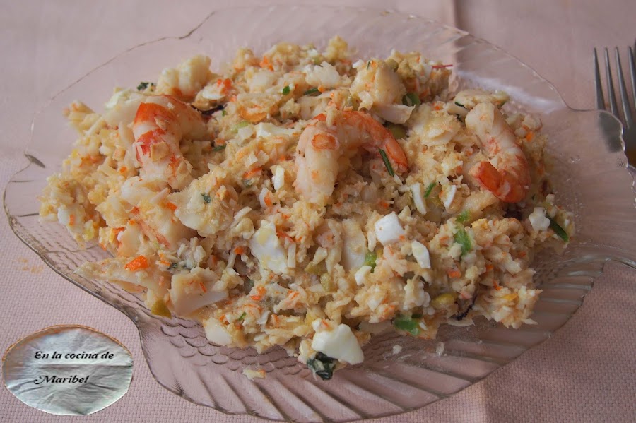 Dejamos enfriar, desmenuzamos la merluza, cortamos los mejillones, los palitos y los langostinos, dejamos alguno para poner enteros por encima Y los huevos. Lo ponemos todo en un bol.