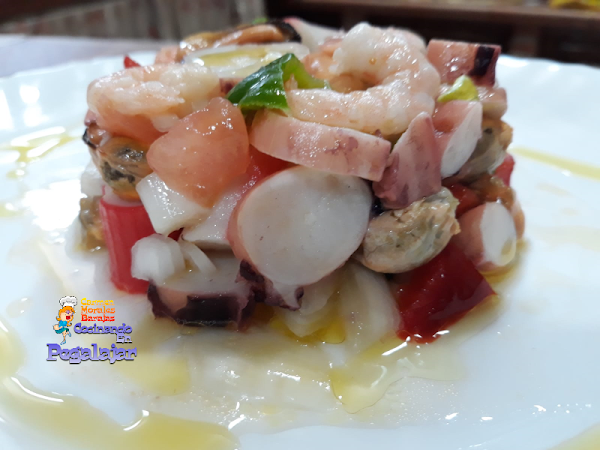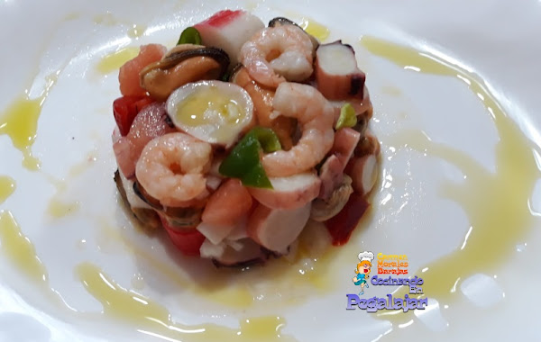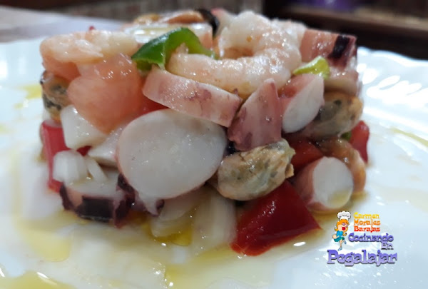 En una fuente o ensaladera colocar todo el Marisco, añadir el picadillo de tomate, pimiento y cebolla y espolvorear el huevo picado. Rocia con un chorro de Aceite de Oliva por encima y a Comer.