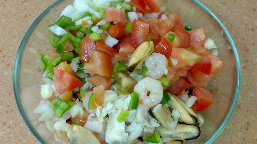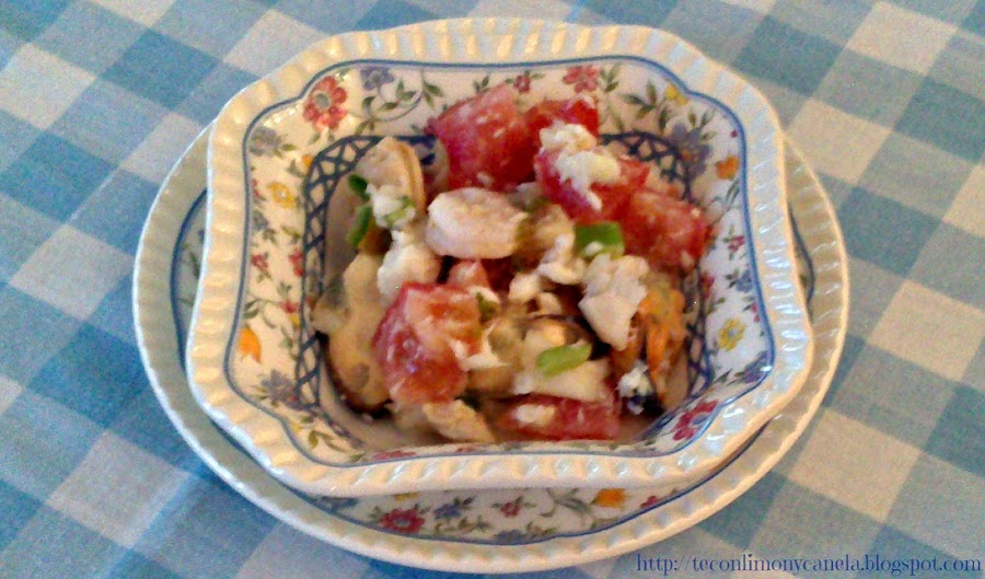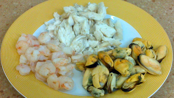 Cuando ya está blanda (unos 5-7 minutos) la saco, y aprovecho el agua para cocer las gambas y los mejillones, ya que al estar congelados, tardan lo mismo en hacerse.