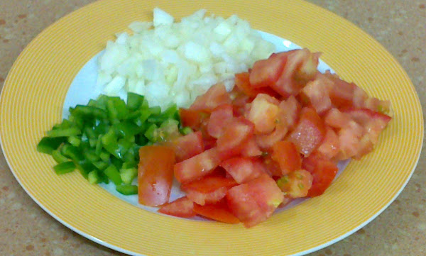 Con el tomate, el pimiento y la cebolla, bien lavados, hago una "brunoise", es decir, los pico en cuadraditos pequeños.