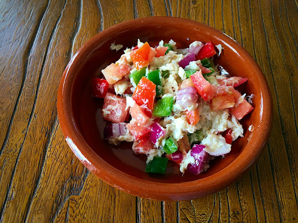 Esta receta es una buena idea de lo que llamamos la cocina de aprovechamiento. Es decir, aquella que se hace a partir de las sobras de otra anterior. En este caso, con lo que quedó de un pescado al horno. Con esos restos, un par de verduras y un buen aliño, nos queda un estupendo Salpicón. Es válido también para el pulpo o los langostinos, por ejemplo. Es cierto que también podemos elaborarla a partir de pescado que no proceda de sobras. Para ello deberíamos dar una cocción al pescado, que puede ser bien al horno o incluso hervido.