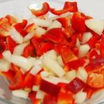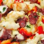 Picamos la cebolla y el pimiento en cuadraditos de unos 2 centímetros y le añadimos los langostinos y el pulpo troceados.