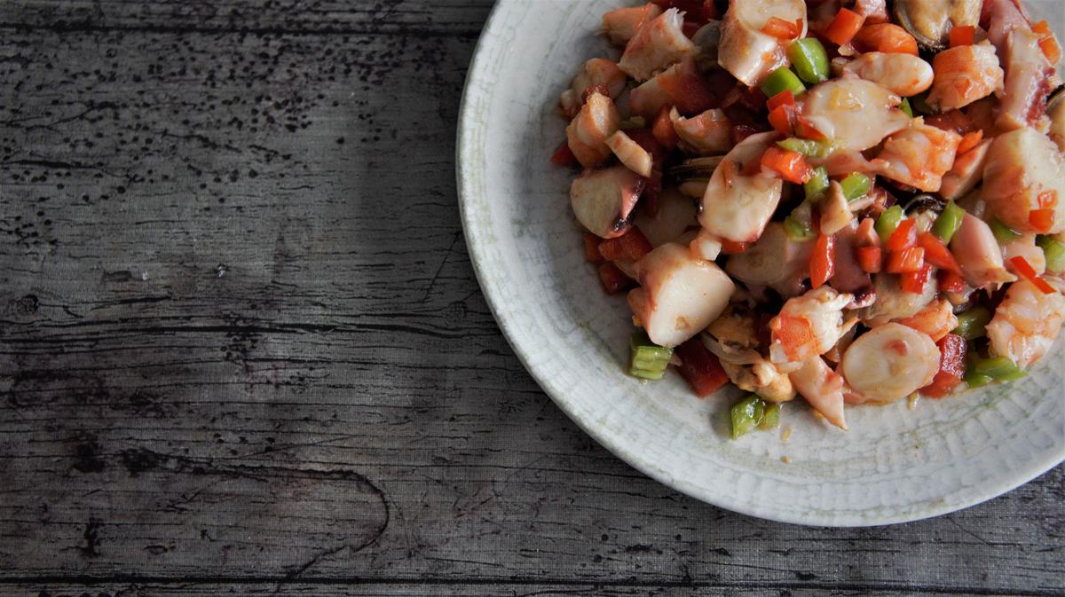 Troceamos el pulpo y los langostinos que habremos pelado previamente.