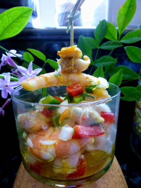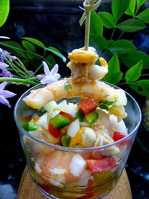 SALPICÓN DE RAPE, BERBERECHOS Y LANGOSTINOS.
