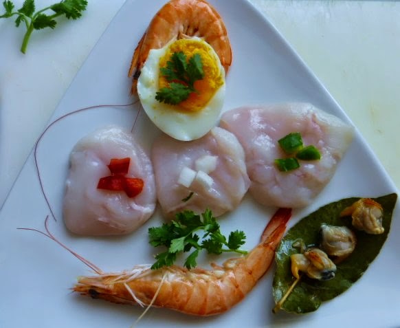 Picamos los pimientos y la cebolla en cuadraditos pequeños y lo ponemos en una ensaladera y añadimos el rape desmenuzado "groseramente" (que se note), los berberechos y los langostinos pelados. Añadimos el cilantro picadito, ½ vaso de vinagre, ¼ vaso de vino blanco, ¼ vaso de aove, sal y pimienta al gusto y removemos todo bien. Finalmente rallamos los huevos cocidos por encima (con el huevo rallado conseguimos que la salsa "espese" un poco y se suavice. Mezclamos todo y servimos.