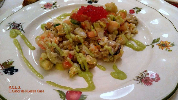 Para terminar extiende unos hilos de crema alioli de aguacate y adorna con huevas de lumpo rojas.