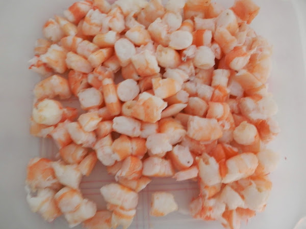 Pelamos y partimos los langostinos en cuatro ó cinco trozos.