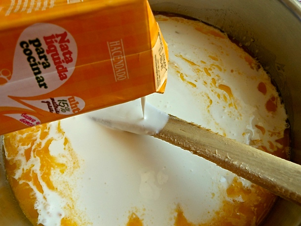 Tras esto vierte la nata (crema de leche) líquida y remueve con tu cuchara de madera hasta que los quesos se hayan derretido.
