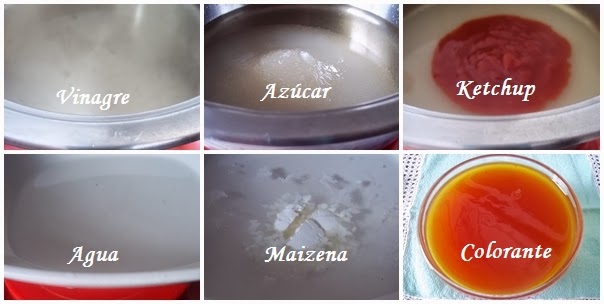 En un caldero pondremos el vinagre, el azúcar y el ketchup.