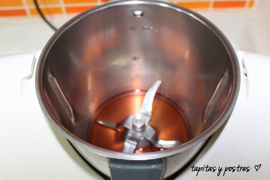 Ponemos el vinagre (yo lo he puesto de vino tinto), el azúcar y el ketchup. Programamos 15 minutos, varoma, velocidad 1 y sin cubilete.
