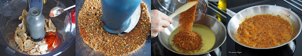 Colocar en el procesador, o en el vaso de la batidora, las rebanadas de pan, las almendras tostadas, el ajo, la nuez moscada y el pimentón. Triturar hasta obtener un grano fino.