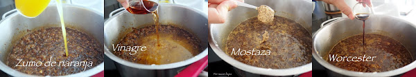 Incorporar el zumo de naranja y el vinagre y continuar la cocción hasta que empiece a hervir. En este punto añadir la mostaza, las salsa Worcester y el ketchup. Mezclar bien y dejar cocer un par de minutos. Verter el tomate triturado y cocer durante 30 minutos.