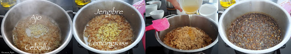 Añadir el ajo picado, dejar dorar e incorporar el jengibre y la hierba limón. Dorar el conjunto.