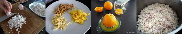 Pelar y cortar las cebollas en daditos pequeños. Pelar y picar fino los ajos y el jengibre. Machacar la hierba limón y cortarla en trocitos pequeños.