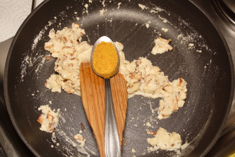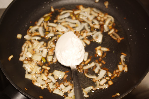 Echamos la harina, removemos unos minutos para que se cocine, añadimos el curry, seguimos removiendo y vamos añadiendo poco a poco la leche (o si lo preferís el caldo). Mezclamos todo bien, procurando que no se nos pegue al fondo de la sartén.