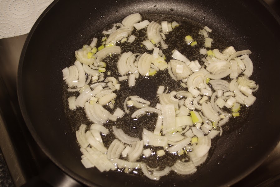 Limpiamos y picamos finamente la cebolleta. La ponemos en una sartén con un chorro de aceite de oliva y la pochamos, que se dore bastante.