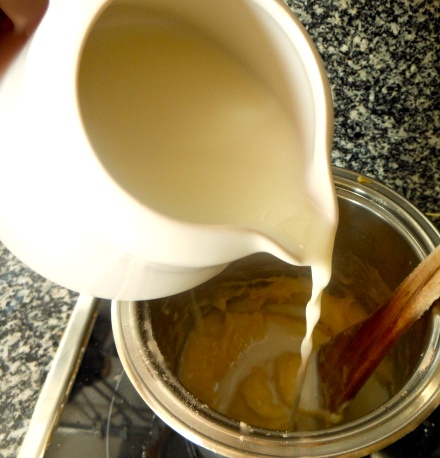 Tras esto agrega poco a poco la leche fría, removiendo continuamente con una cuchara de madera o con unas varillas manuales hasta conseguir una mezcla homogénea.
