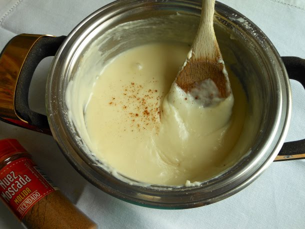 Seguidamente añade la sal fina, la pimienta negra molida y la nuez moscada. Vuelve a remover y deja la salsa a fuego suave durante 10-15 minutos removiendo de vez en cuando.