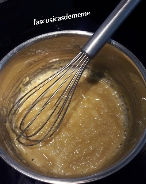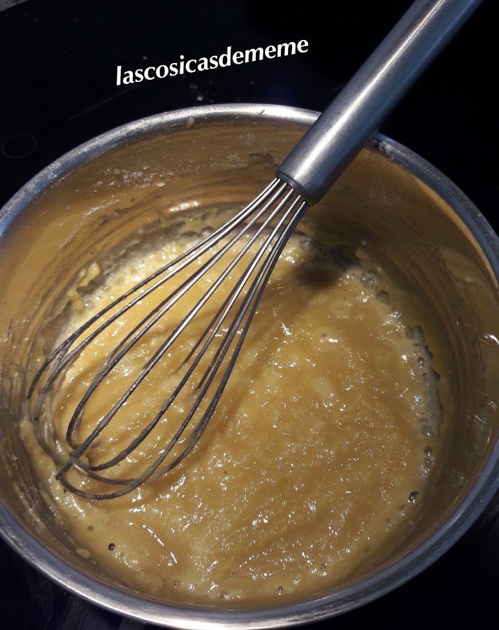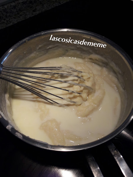 Lo rehogamos un poco y comenzamos a añadir la leche caliente, poco a poco sobre la masa que se nos ha formado, tenemos que evitar se hagan grumos, por eso a mí me gusta hacerlo con las varillas.