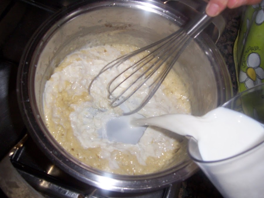 En este momento añadimos la leche caliente sin dejar de mover hasta que espese.