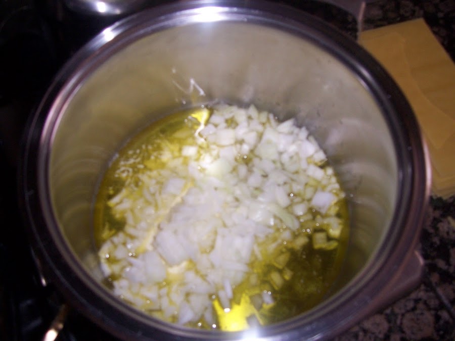 Ponemos a calentar el aceite y la mantequilla, cuando la mantequilla se derrita (pero sin dejar que se queme) añadimos la cebolla muy picadita con un puñado de sal y la rehogamos a fuego lento hasta que esté doradita, cambie de color y huela como a dulce. Unos 10 minutos.