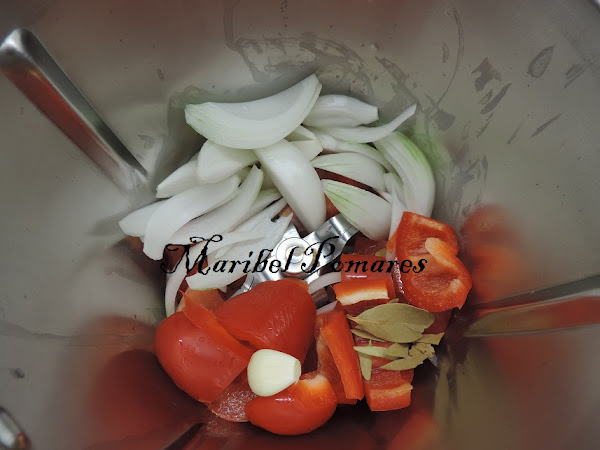 Echamos en el vaso del thermomix la cebolla, ajo, tomate, pimiento y laurel.