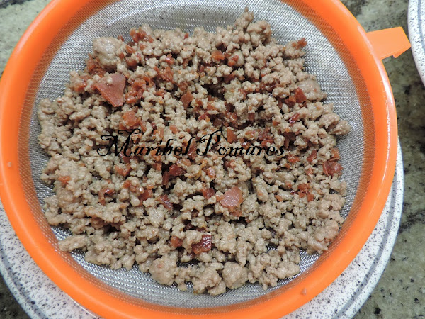Echamos la carne al colador donde teníamos escurriendo el jamón serrano.