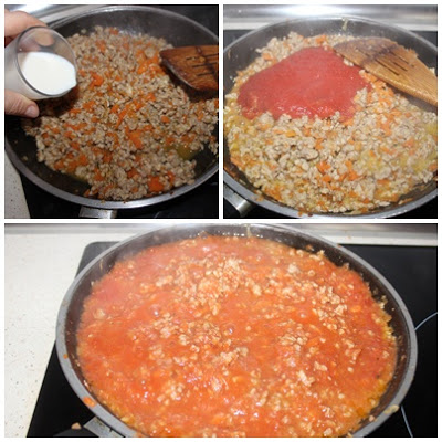 En una sartén ponemos el aceite y freímos la cebolla muy picadita, yo la pico con la picadora. Cuando esté transparente añadimos la carne picada aliñada con sal, pimienta molida y nuez moscada al gusto. La sofreímos muy bien.