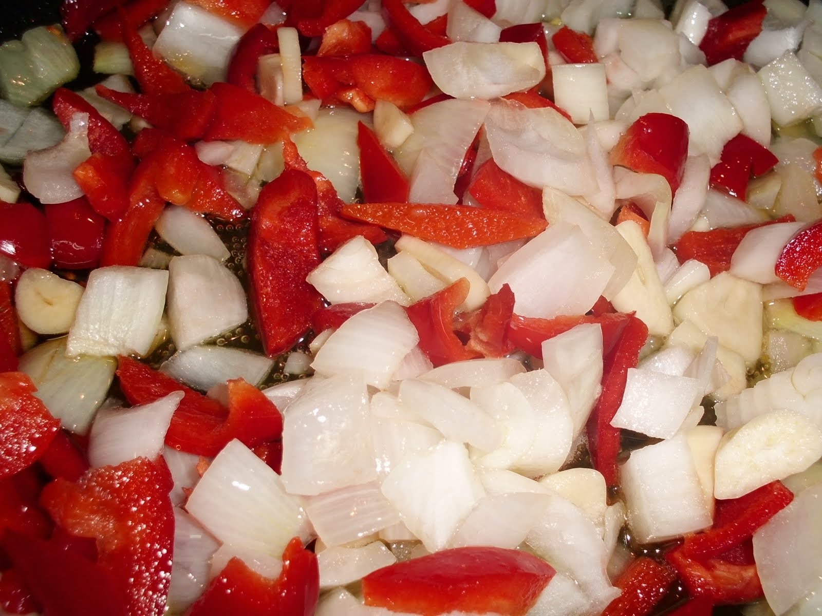Troceamos la cebolla, los pimientos, las guindillas y los ajos, los ponemos en una sarten grande y los pochamos con un poco de aceite de oliva