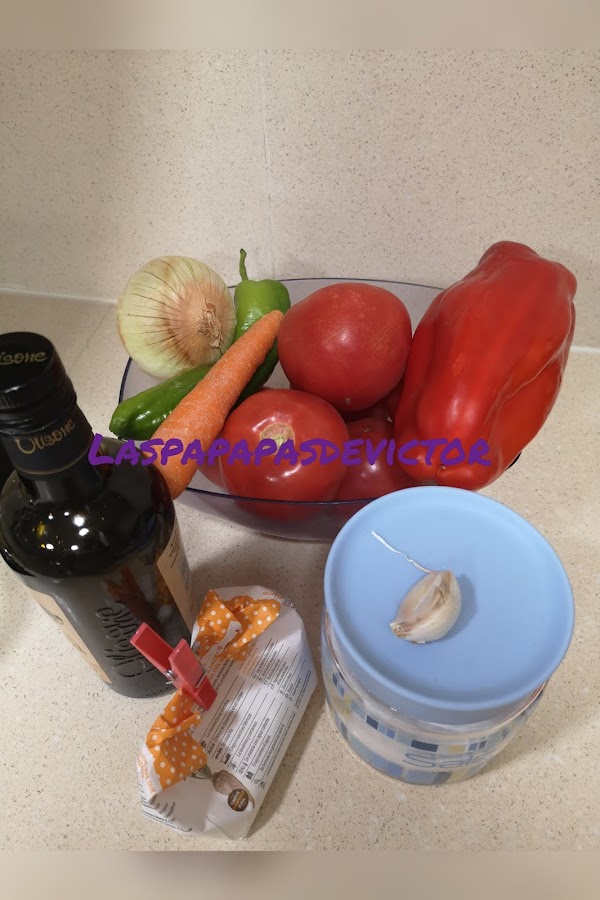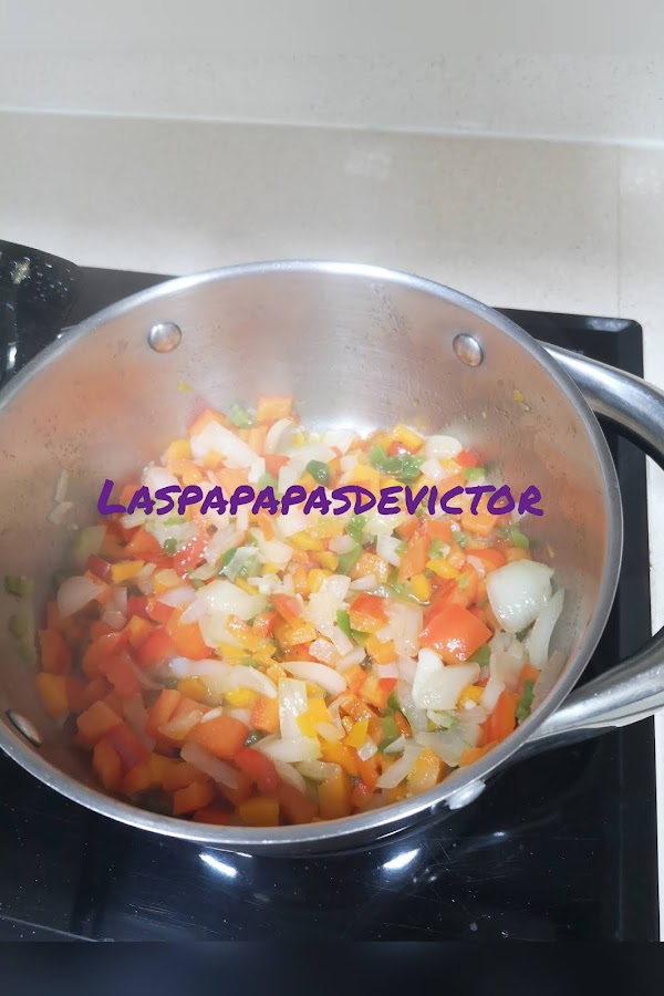 En una olla poner un poco de aceite, incorporar todas las verduras menos los tomares, o sea cebolla, pimiento verde, ajo, zanahoria