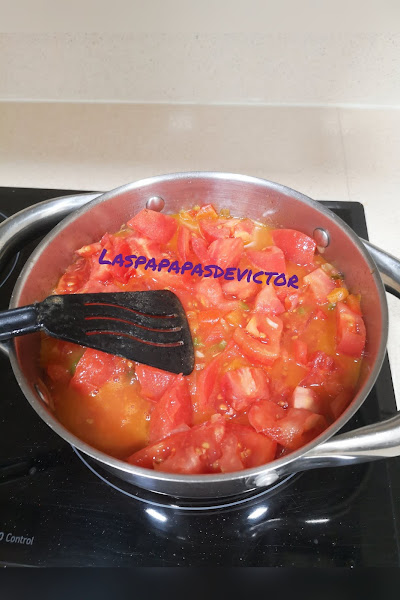 Una vez pochadas las verduras añadir los tomates sin pelar solo sin el ojo