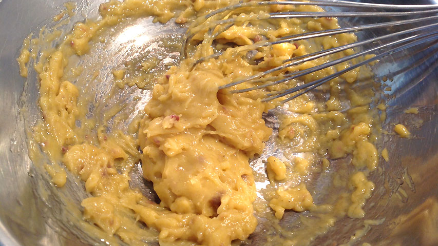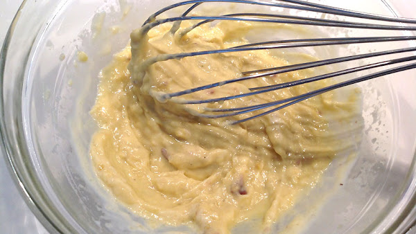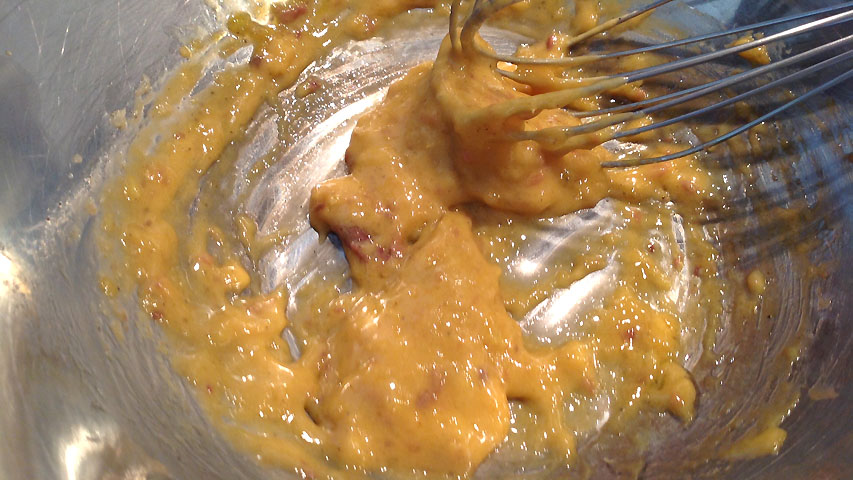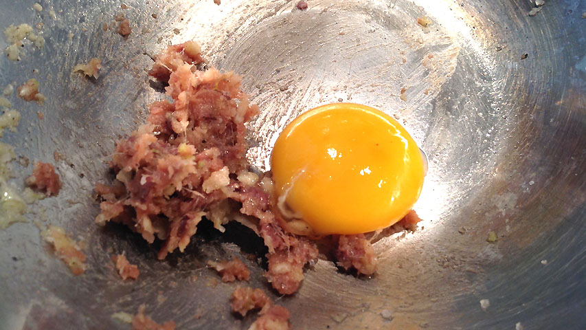Cuando las anchoas se hayan incorporado a la "pasta" añade una yema de huevo y bate con la varilla de mano.