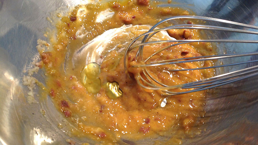 Añade unas gotas de aceite de oliva y bate hasta incorporarlo, más aceite de oliva y bate hasta incorporarlo...