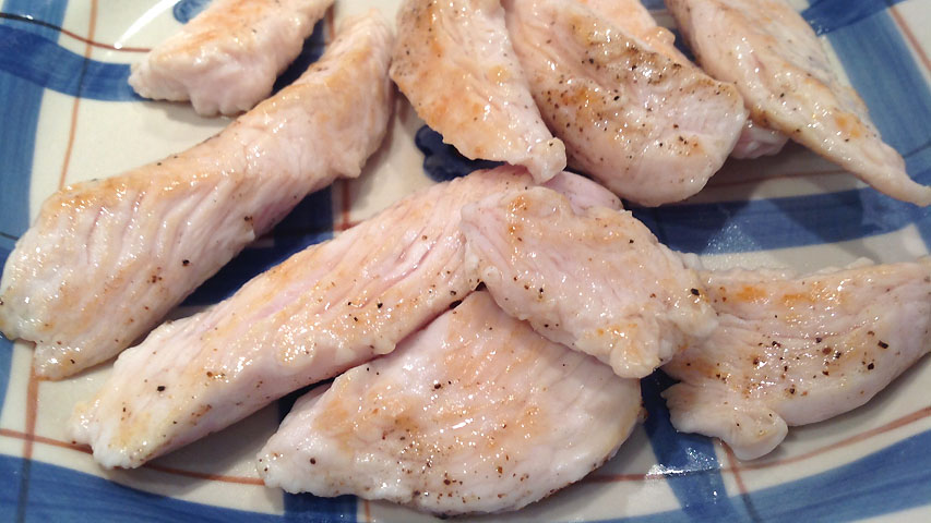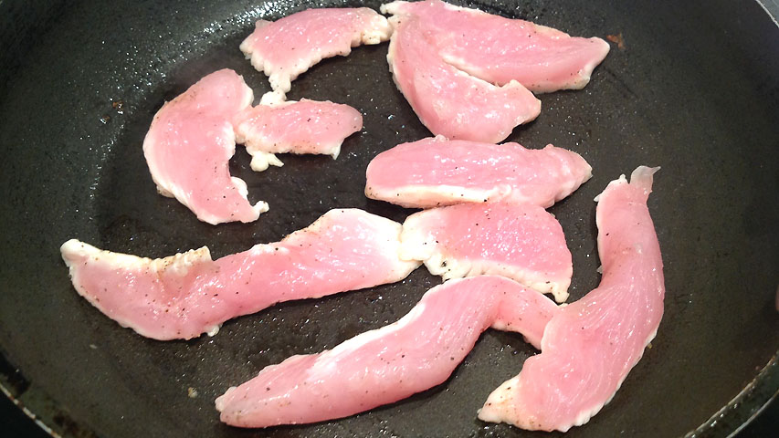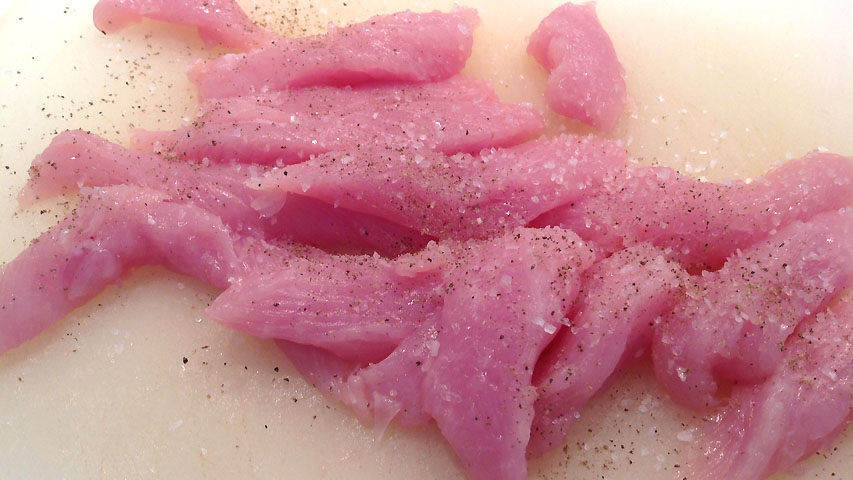 Prepara unas tiras de pechuga de pollo o pavo (esto es pavo) con sal y pimienta.