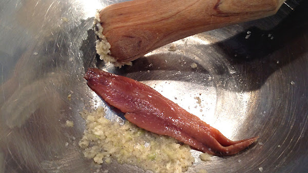 Cuando hayas conseguido una "pasta" de ajo, incorpora un par de anchoas.