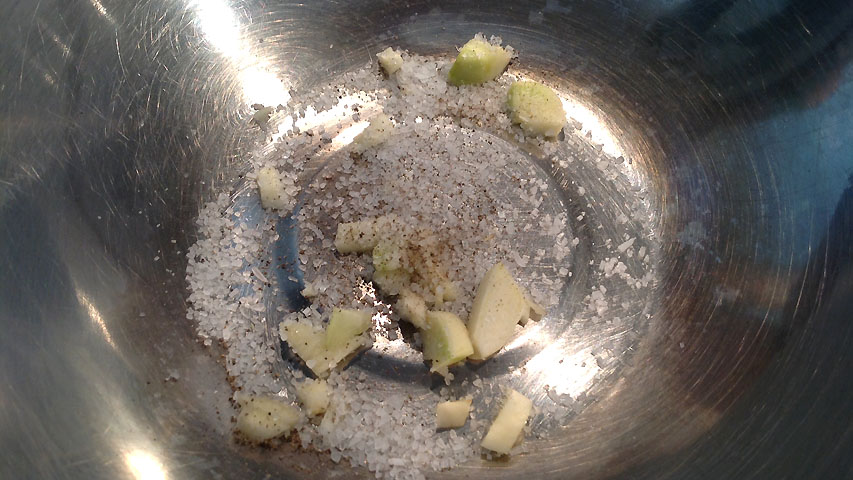 En un bol introduce un ajo picado junto a un poco de sal marina y pimienta negra molida. Machaca todo con el mortero hasta hacer una pasta.