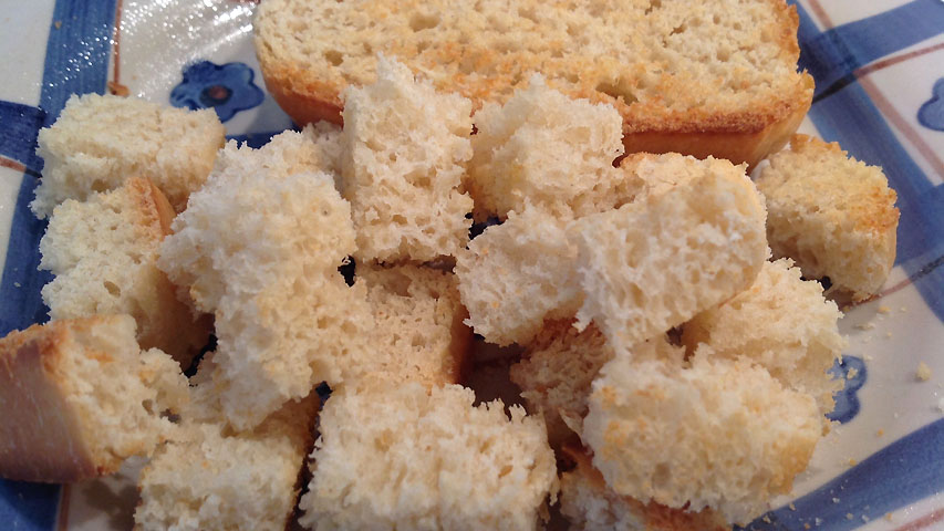 Tuesta el pan y córtalo en cubitos. Reserva.