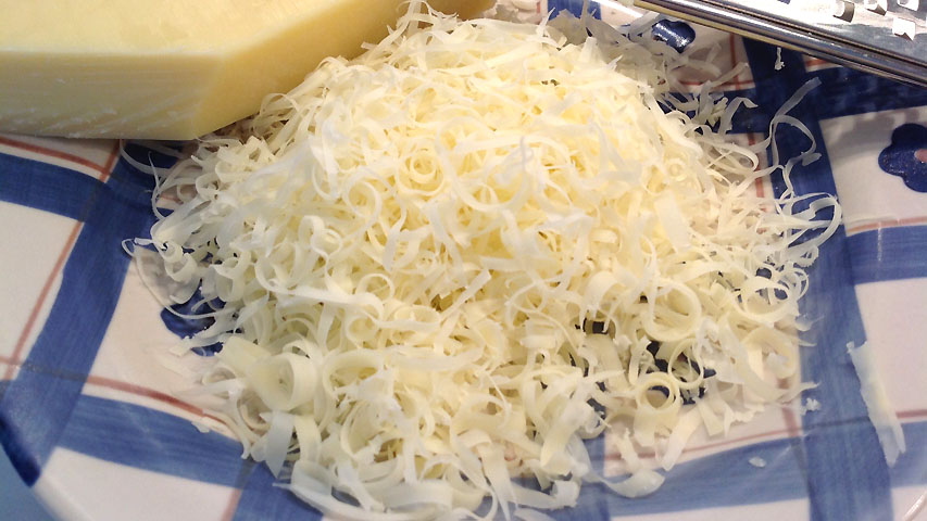 Ralla una cuña de queso parmesano (u otro queso curado de vaca) para incorporarlo a la salsa y para después poner sobre la ensalada.