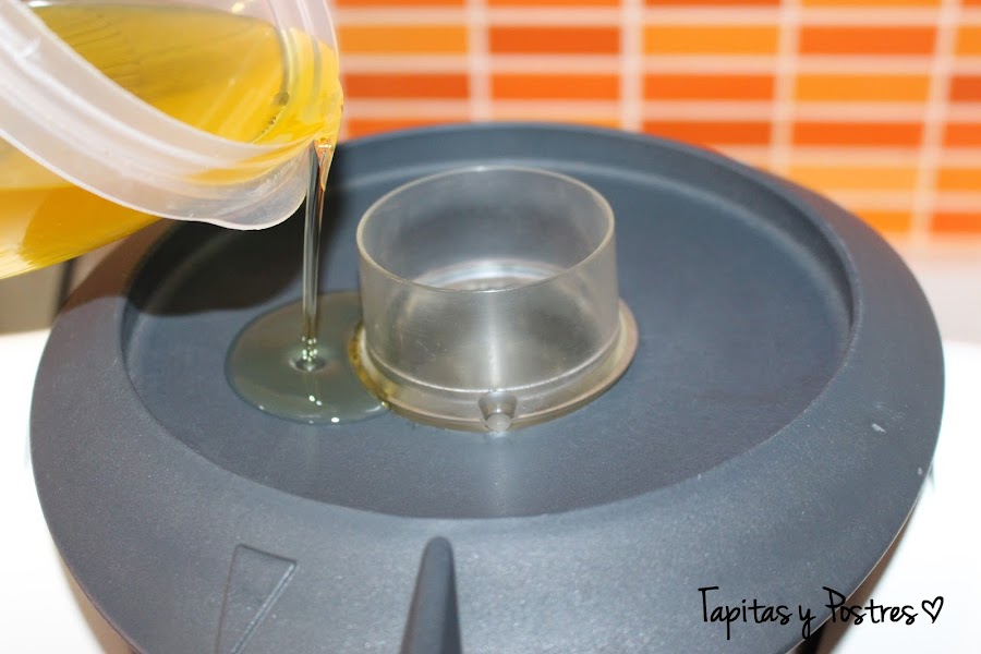 Ponemos el cubilete sobre la tapadera, y vamos echando muy despacio el aceite en velocidad 5 (como si hicieramos mayonesa).