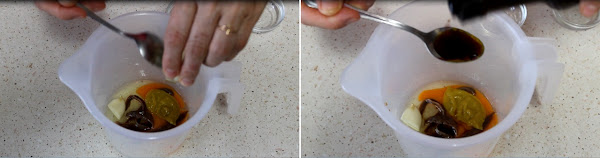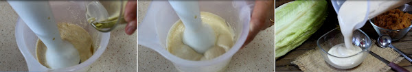 En el vaso de la batidora ponemos el huevo, el ajo, el zumo de limón, la salsa perrins, la miel, las anchoas, la mostaza, la pimienta molida y el vinagre. Lo batimos todo bien...